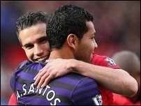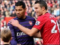 Болельщики "Арсенала" призывают клуб наказать защитника Андре Сантоса за обмен футболкой с нападающим "Манчестер Юнайтед" Ван Перси после первого тайма субботнего матча Премьер-Лиги на "Олд Траффорд".